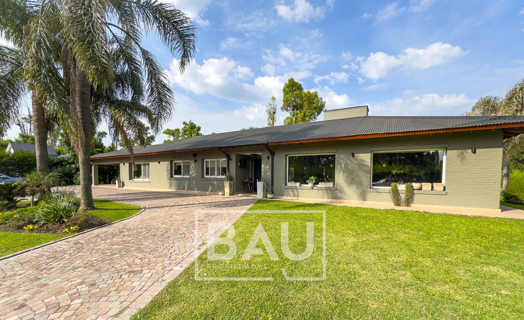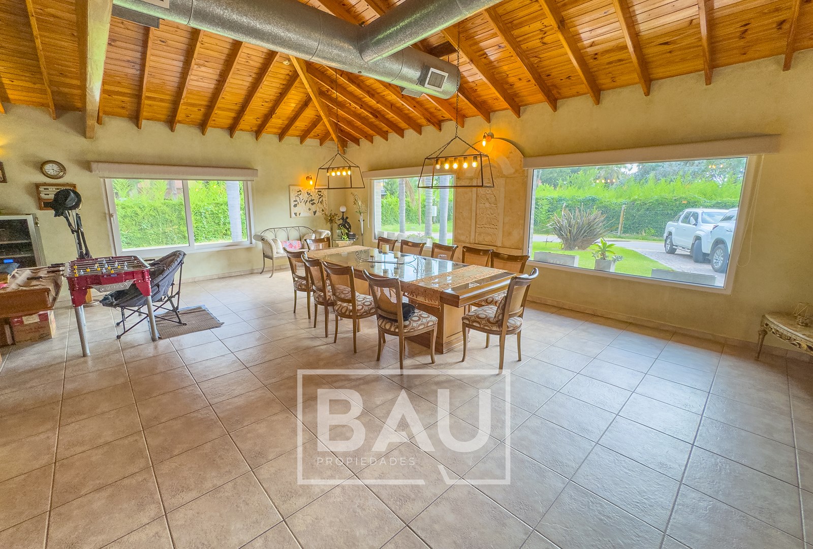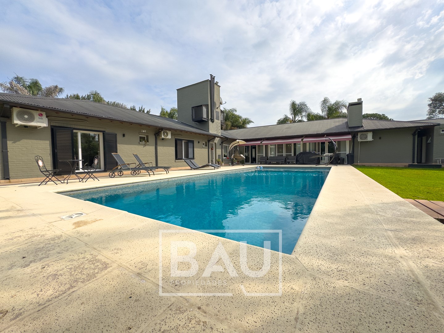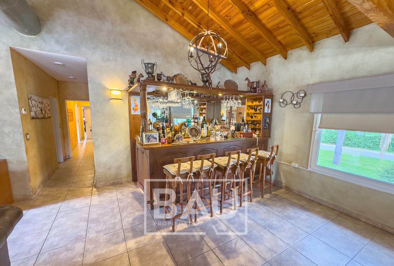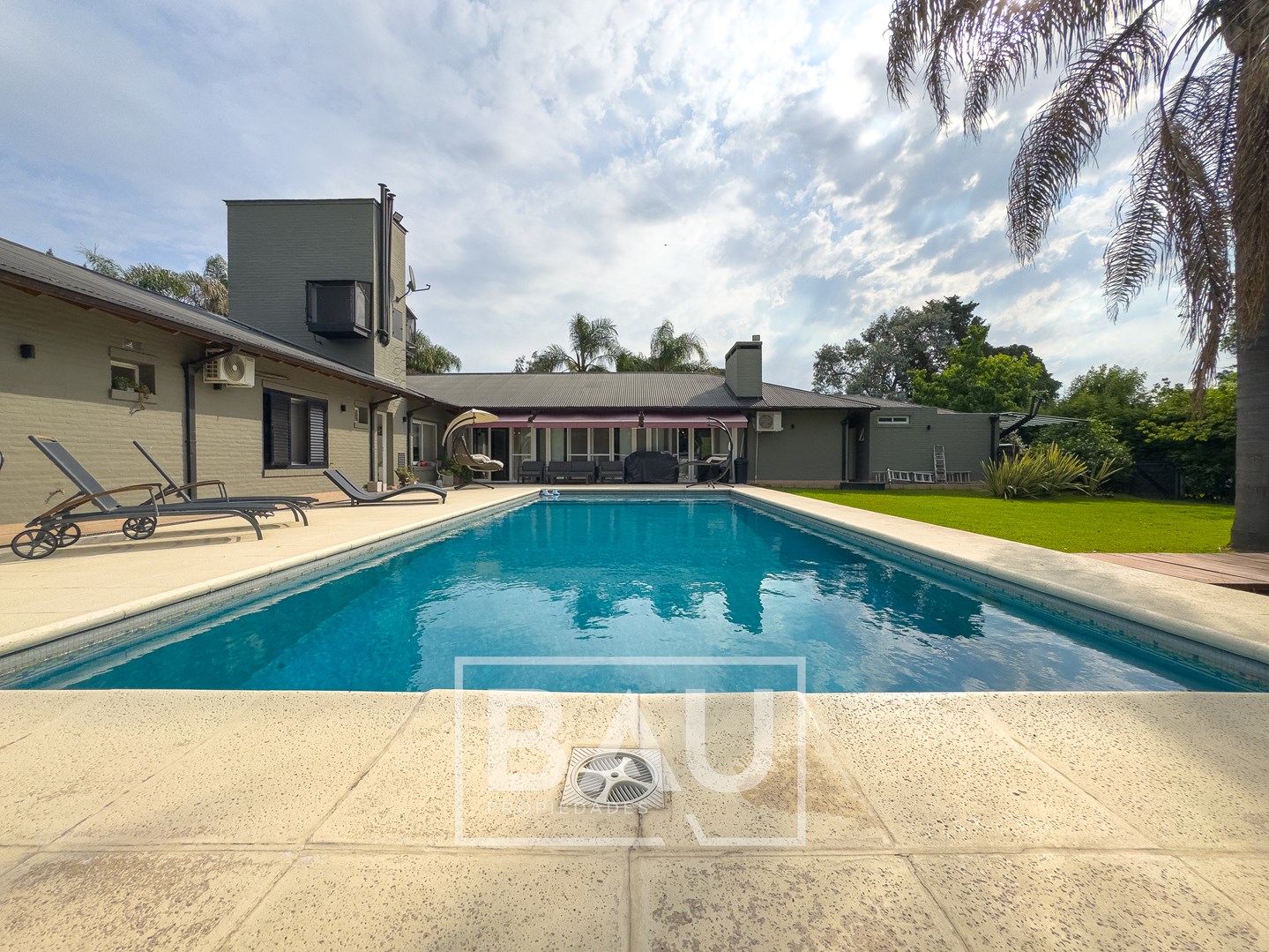BAU PROPIEDADES – VENTA – CASA EN UNA PLANTA – 4 DORMITORIOS – EXCELENTE CONSTRUCCIÓN – COUNTRY CLUB SAN DIEGO Sólido chalet tradicional desarrollado íntegramente en una planta, implantado sobre un amplio lote de 1.500 m², con muy buena orientación y un entorno consolidado. Una propiedad que se destaca por su calidad constructiva, funcionalidad y luminosidad en todos sus ambientes. Al ingresar, un hall de recepción da paso a un amplio living comedor con barra, grandes ventanales al jardín y excelente entrada de luz natural. La casa cuenta con calefacción central por aire mediante dos calderas y aire acondicionado en todos los ambientes, garantizando confort durante todo el año. La cocina se presenta muy bien equipada, con mesadas de Silestone, campana de acero, horno empotrado, gran espacio de guardado y despensa. Conecta de manera práctica con el sector social y el quincho. El quincho cerrado funciona como un verdadero segundo estar, con parrilla de acero con puerta guillotina y horno pizzero Tromen. La distribución privada ofrece cuatro dormitorios. El dormitorio principal es en suite con vestidor y dos baños completos, brindando comodidad y privacidad. Dos dormitorios adicionales con placard comparten un baño completo, y se suma un cuarto dormitorio que puede utilizarse como habitación de huéspedes o escritorio. Además, cuenta con un playroom independiente. En el exterior, el jardín parquizado se disfruta plenamente. La piscina climatizada, revestida en venecitas, mide aproximadamente 12 x 5 metros y cuenta con solárium de piso antideslizante. Se suma un baño de pileta con vestuario, jardín de invierno, gazebo vidriado con vista abierta al parque, toldo corredizo y riego automático. La propiedad dispone de cochera cubierta para dos autos, espacio de guardado adicional, galpón y sala de máquinas. Como valor agregado, cuenta con grupo electrógeno a gas de 40 kVA y cortinas blackout automatizadas. Todas las aberturas son de PVC con DVH, optimizando aislamiento térmico y acústico. Una casa muy completa, bien mantenida y lista para mudarse, ideal para quienes buscan vivir en una sola planta, con amplios espacios interiores y exteriores, dentro de un entorno seguro y consolidado. Consultanos para más información o para coordinar una visita. Esta propiedad merece ser recorrida para apreciar cada detalle. *La información comercial incluida representa material de carácter informativo y/o ilustrativo, pudiendo no ser exacta, estar sujeta a errores, omisiones y cambios, incluyendo el precio o la retirada de la oferta sin previo aviso. BAU PROPIEDADES SAN DIEGO