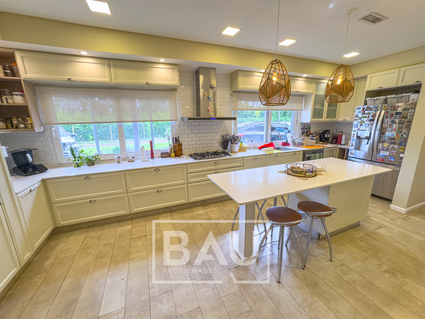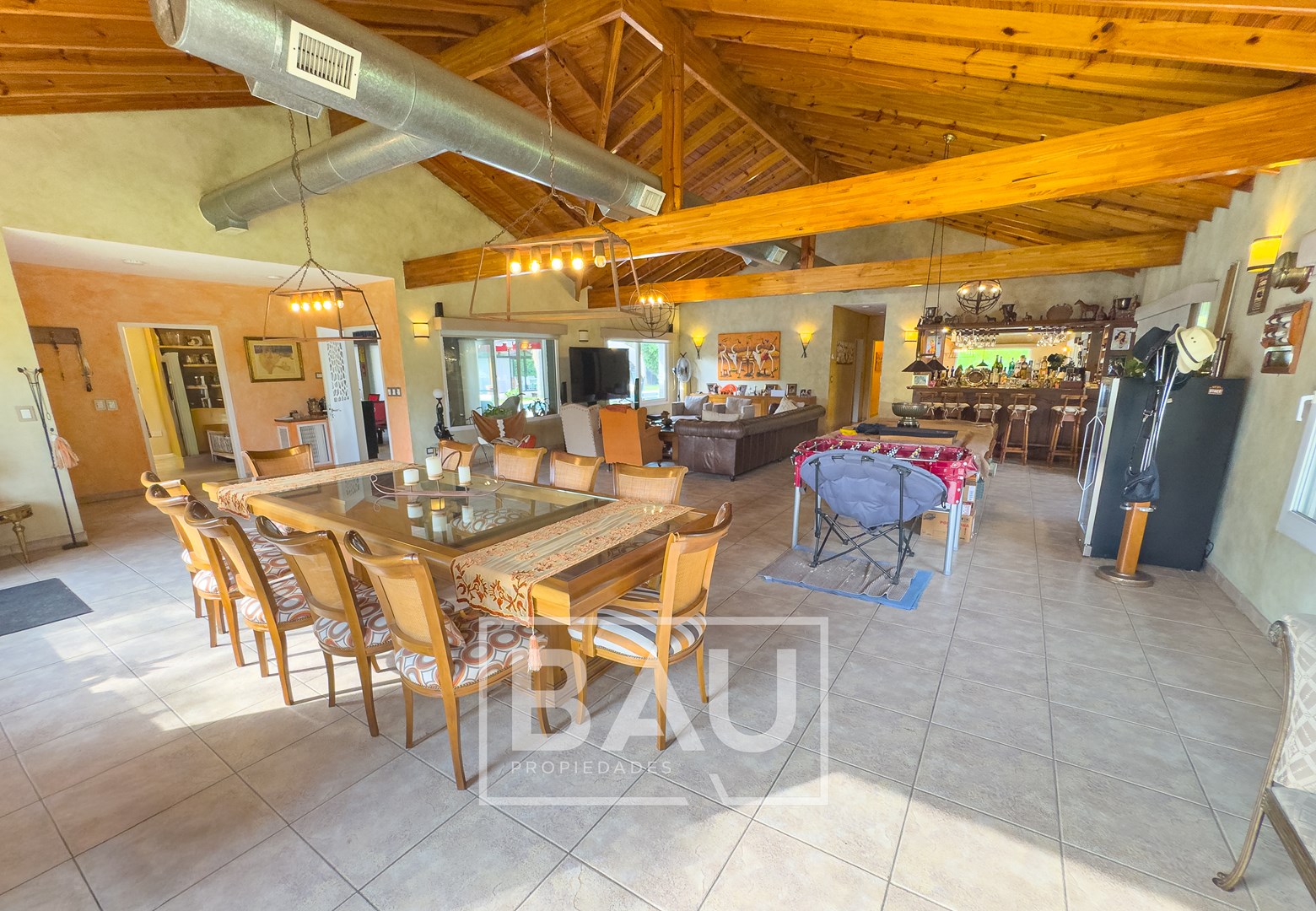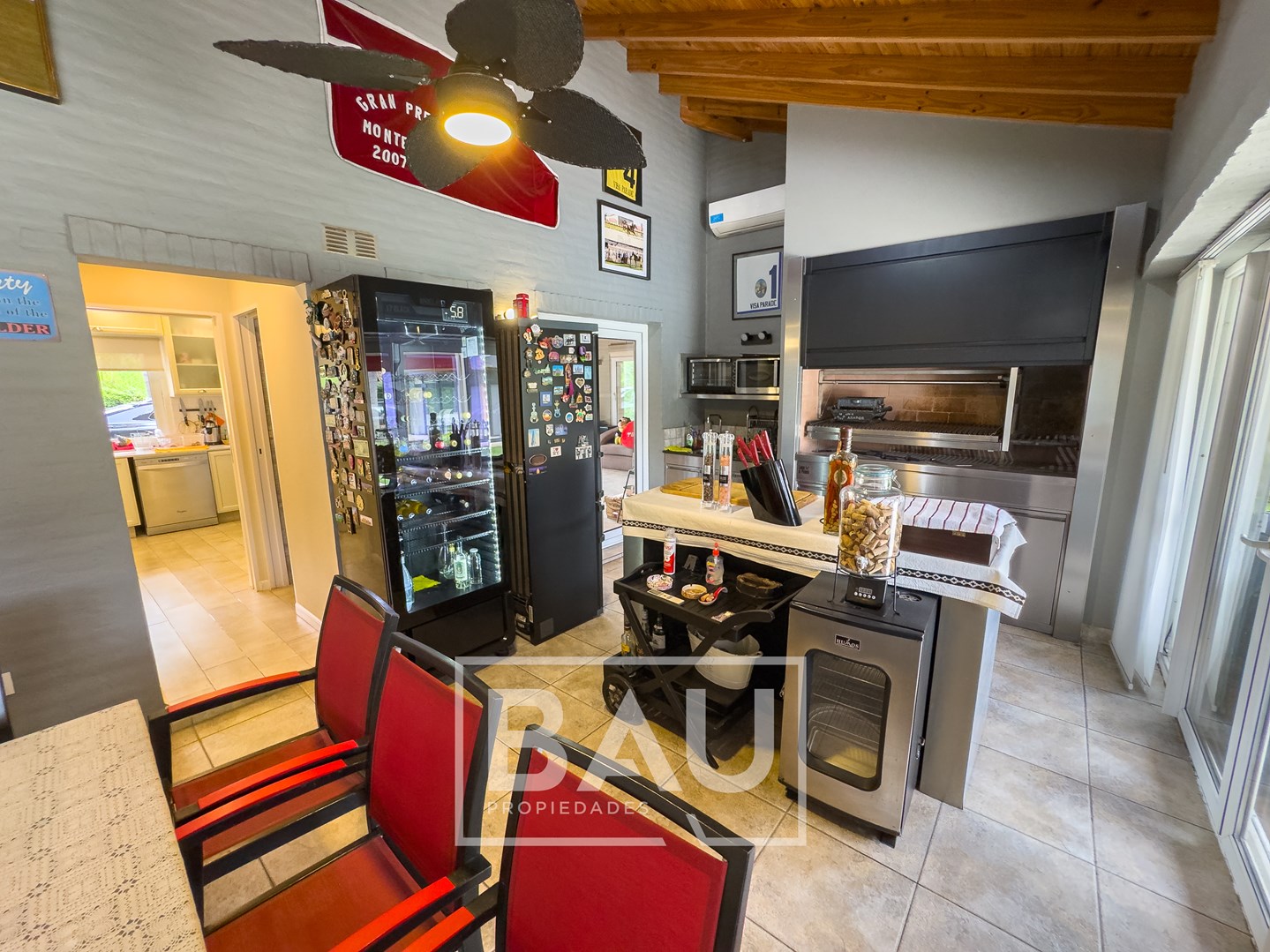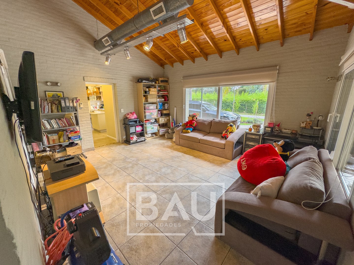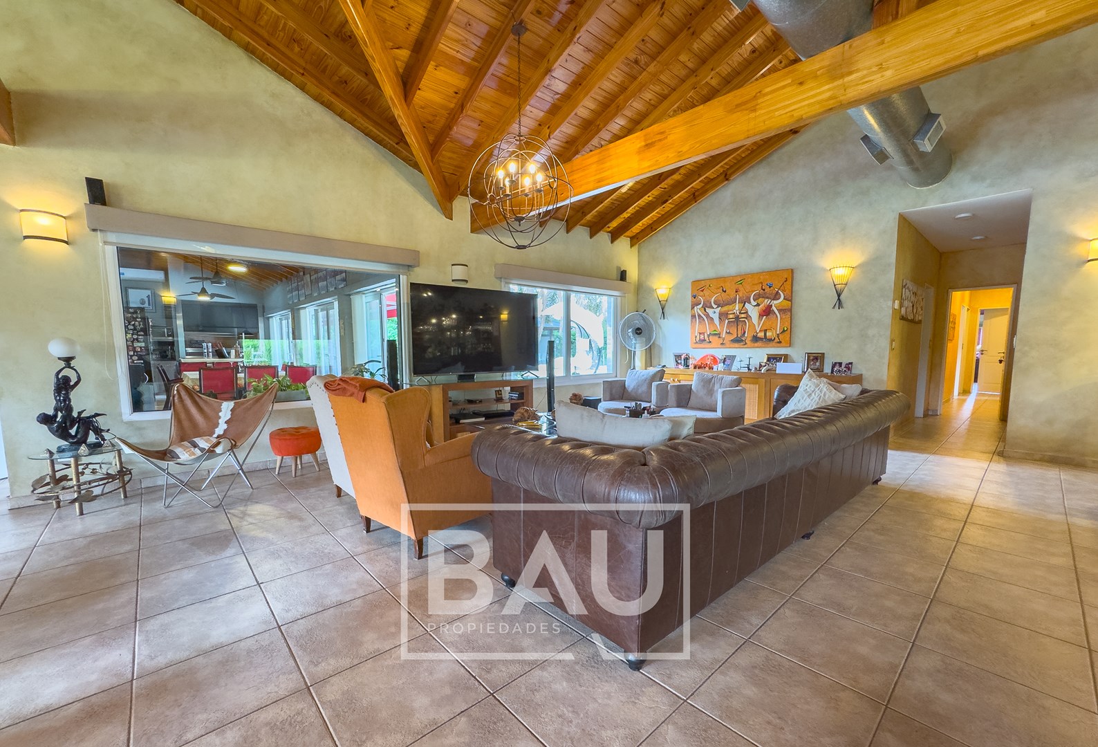 BAU PROPIEDADES – VENTA – CASA EN UNA PLANTA – 4 DORMITORIOS – EXCELENTE CONSTRUCCIÓN – COUNTRY CLUB SAN DIEGO Sólido chalet tradicional desarrollado íntegramente en una planta, implantado sobre un amplio lote de 1.500 m², con muy buena orientación y un entorno consolidado. Una propiedad que se destaca por su calidad constructiva, funcionalidad y luminosidad en todos sus ambientes. Al ingresar, un hall de recepción da paso a un amplio living comedor con barra, grandes ventanales al jardín y excelente entrada de luz natural. La casa cuenta con calefacción central por aire mediante dos calderas y aire acondicionado en todos los ambientes, garantizando confort durante todo el año. La cocina se presenta muy bien equipada, con mesadas de Silestone, campana de acero, horno empotrado, gran espacio de guardado y despensa. Conecta de manera práctica con el sector social y el quincho. El quincho cerrado funciona como un verdadero segundo estar, con parrilla de acero con puerta guillotina y horno pizzero Tromen. La distribución privada ofrece cuatro dormitorios. El dormitorio principal es en suite con vestidor y dos baños completos, brindando comodidad y privacidad. Dos dormitorios adicionales con placard comparten un baño completo, y se suma un cuarto dormitorio que puede utilizarse como habitación de huéspedes o escritorio. Además, cuenta con un playroom independiente. En el exterior, el jardín parquizado se disfruta plenamente. La piscina climatizada, revestida en venecitas, mide aproximadamente 12 x 5 metros y cuenta con solárium de piso antideslizante. Se suma un baño de pileta con vestuario, jardín de invierno, gazebo vidriado con vista abierta al parque, toldo corredizo y riego automático. La propiedad dispone de cochera cubierta para dos autos, espacio de guardado adicional, galpón y sala de máquinas. Como valor agregado, cuenta con grupo electrógeno a gas de 40 kVA y cortinas blackout automatizadas. Todas las aberturas son de PVC con DVH, optimizando aislamiento térmico y acústico. Una casa muy completa, bien mantenida y lista para mudarse, ideal para quienes buscan vivir en una sola planta, con amplios espacios interiores y exteriores, dentro de un entorno seguro y consolidado. Consultanos para más información o para coordinar una visita. Esta propiedad merece ser recorrida para apreciar cada detalle. *La información comercial incluida representa material de carácter informativo y/o ilustrativo, pudiendo no ser exacta, estar sujeta a errores, omisiones y cambios, incluyendo el precio o la retirada de la oferta sin previo aviso. BAU PROPIEDADES SAN DIEGO