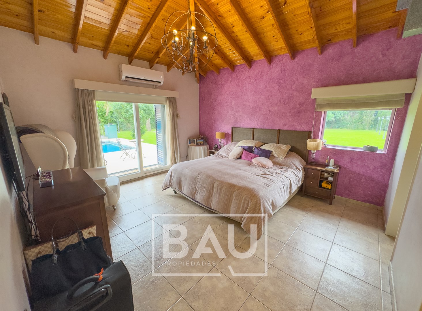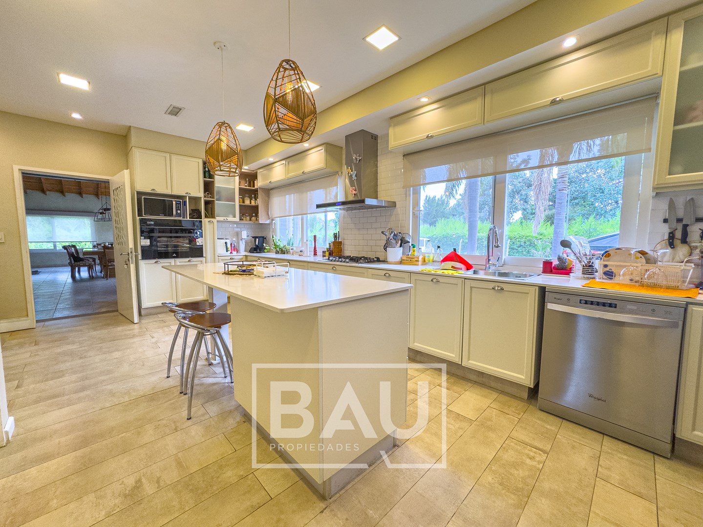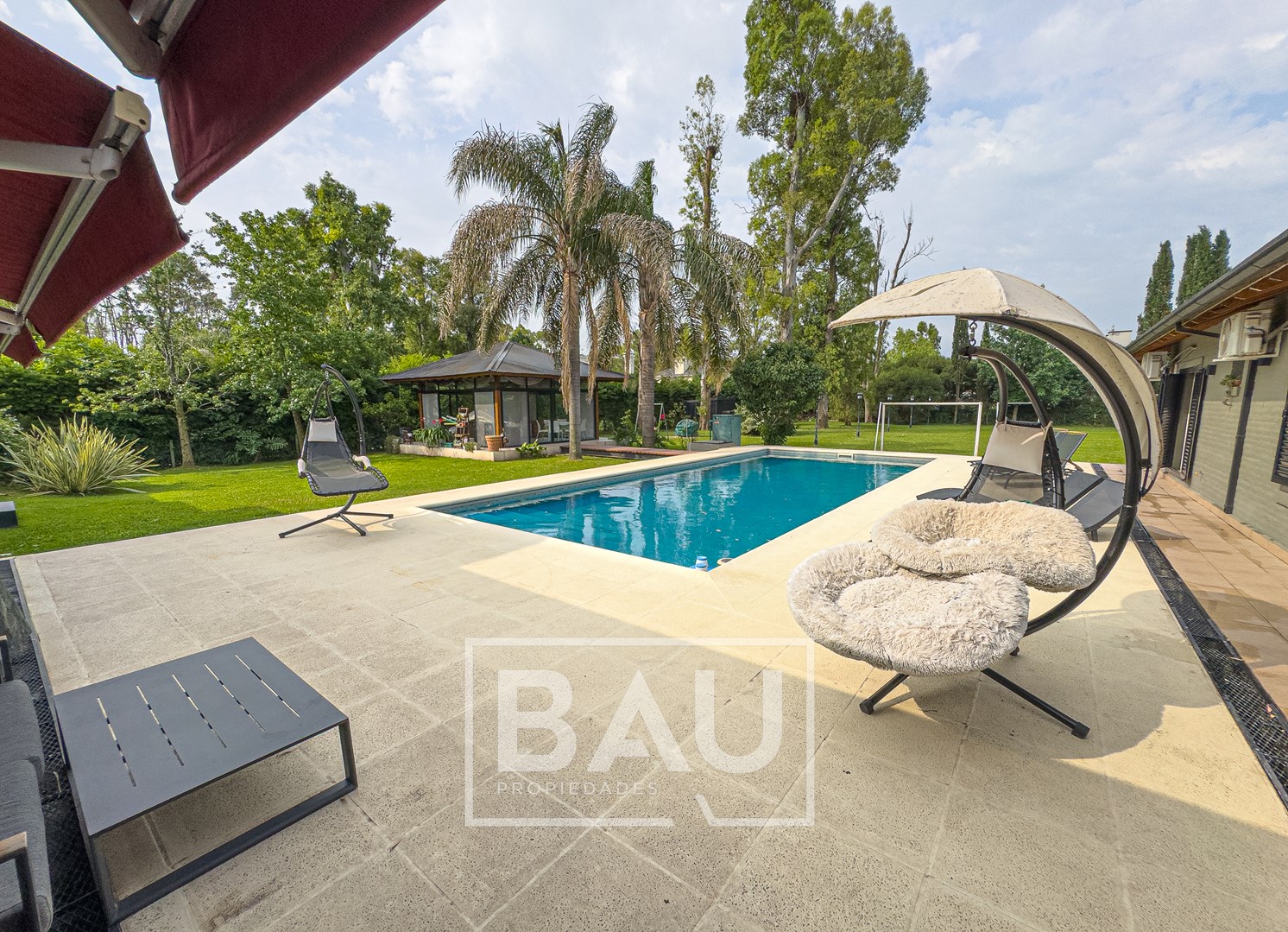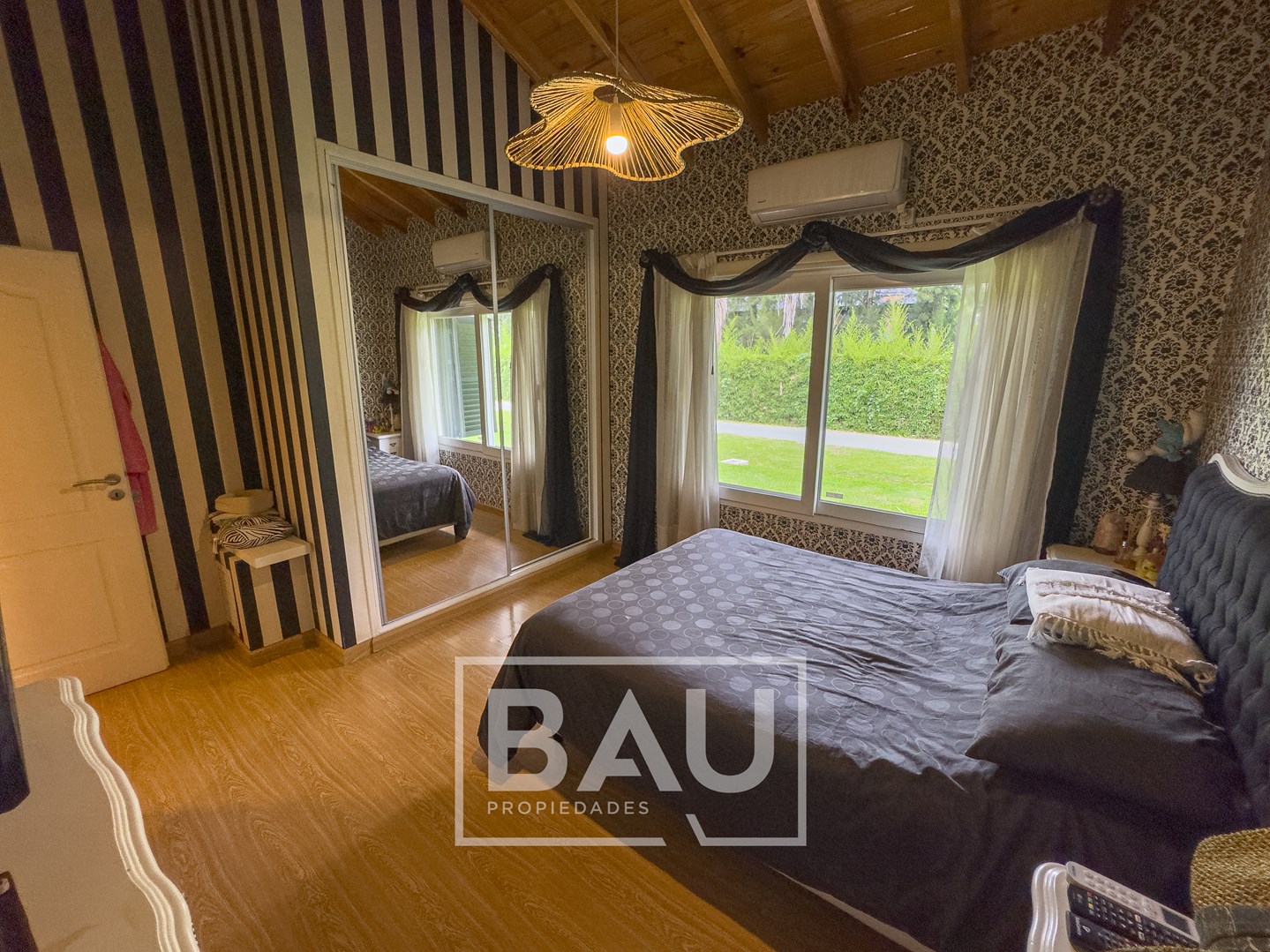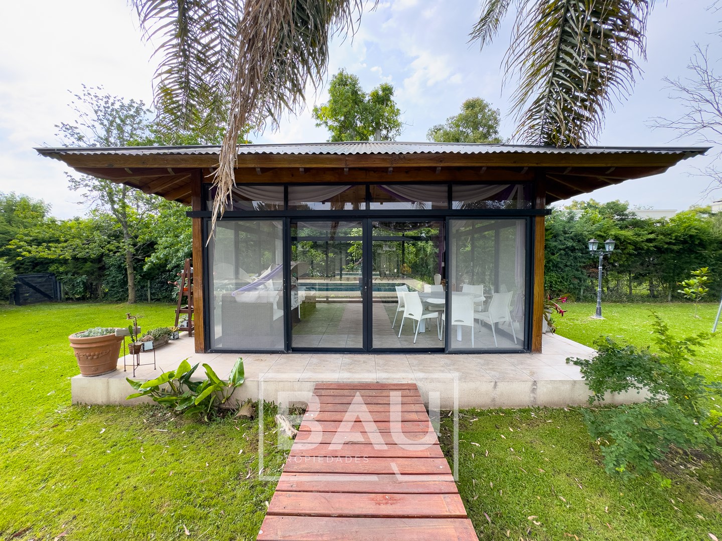 BAU PROPIEDADES – VENTA – CASA EN UNA PLANTA – 4 DORMITORIOS – EXCELENTE CONSTRUCCIÓN – COUNTRY CLUB SAN DIEGO Sólido chalet tradicional desarrollado íntegramente en una planta, implantado sobre un amplio lote de 1.500 m², con muy buena orientación y un entorno consolidado. Una propiedad que se destaca por su calidad constructiva, funcionalidad y luminosidad en todos sus ambientes. Al ingresar, un hall de recepción da paso a un amplio living comedor con barra, grandes ventanales al jardín y excelente entrada de luz natural. La casa cuenta con calefacción central por aire mediante dos calderas y aire acondicionado en todos los ambientes, garantizando confort durante todo el año. La cocina se presenta muy bien equipada, con mesadas de Silestone, campana de acero, horno empotrado, gran espacio de guardado y despensa. Conecta de manera práctica con el sector social y el quincho. El quincho cerrado funciona como un verdadero segundo estar, con parrilla de acero con puerta guillotina y horno pizzero Tromen. La distribución privada ofrece cuatro dormitorios. El dormitorio principal es en suite con vestidor y dos baños completos, brindando comodidad y privacidad. Dos dormitorios adicionales con placard comparten un baño completo, y se suma un cuarto dormitorio que puede utilizarse como habitación de huéspedes o escritorio. Además, cuenta con un playroom independiente. En el exterior, el jardín parquizado se disfruta plenamente. La piscina climatizada, revestida en venecitas, mide aproximadamente 12 x 5 metros y cuenta con solárium de piso antideslizante. Se suma un baño de pileta con vestuario, jardín de invierno, gazebo vidriado con vista abierta al parque, toldo corredizo y riego automático. La propiedad dispone de cochera cubierta para dos autos, espacio de guardado adicional, galpón y sala de máquinas. Como valor agregado, cuenta con grupo electrógeno a gas de 40 kVA y cortinas blackout automatizadas. Todas las aberturas son de PVC con DVH, optimizando aislamiento térmico y acústico. Una casa muy completa, bien mantenida y lista para mudarse, ideal para quienes buscan vivir en una sola planta, con amplios espacios interiores y exteriores, dentro de un entorno seguro y consolidado. Consultanos para más información o para coordinar una visita. Esta propiedad merece ser recorrida para apreciar cada detalle. *La información comercial incluida representa material de carácter informativo y/o ilustrativo, pudiendo no ser exacta, estar sujeta a errores, omisiones y cambios, incluyendo el precio o la retirada de la oferta sin previo aviso. BAU PROPIEDADES SAN DIEGO