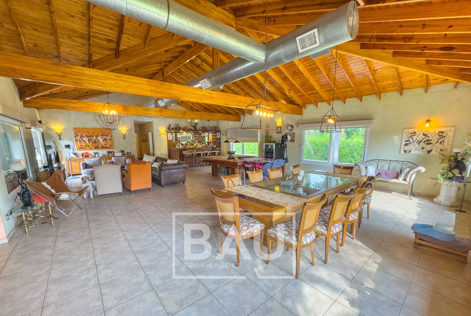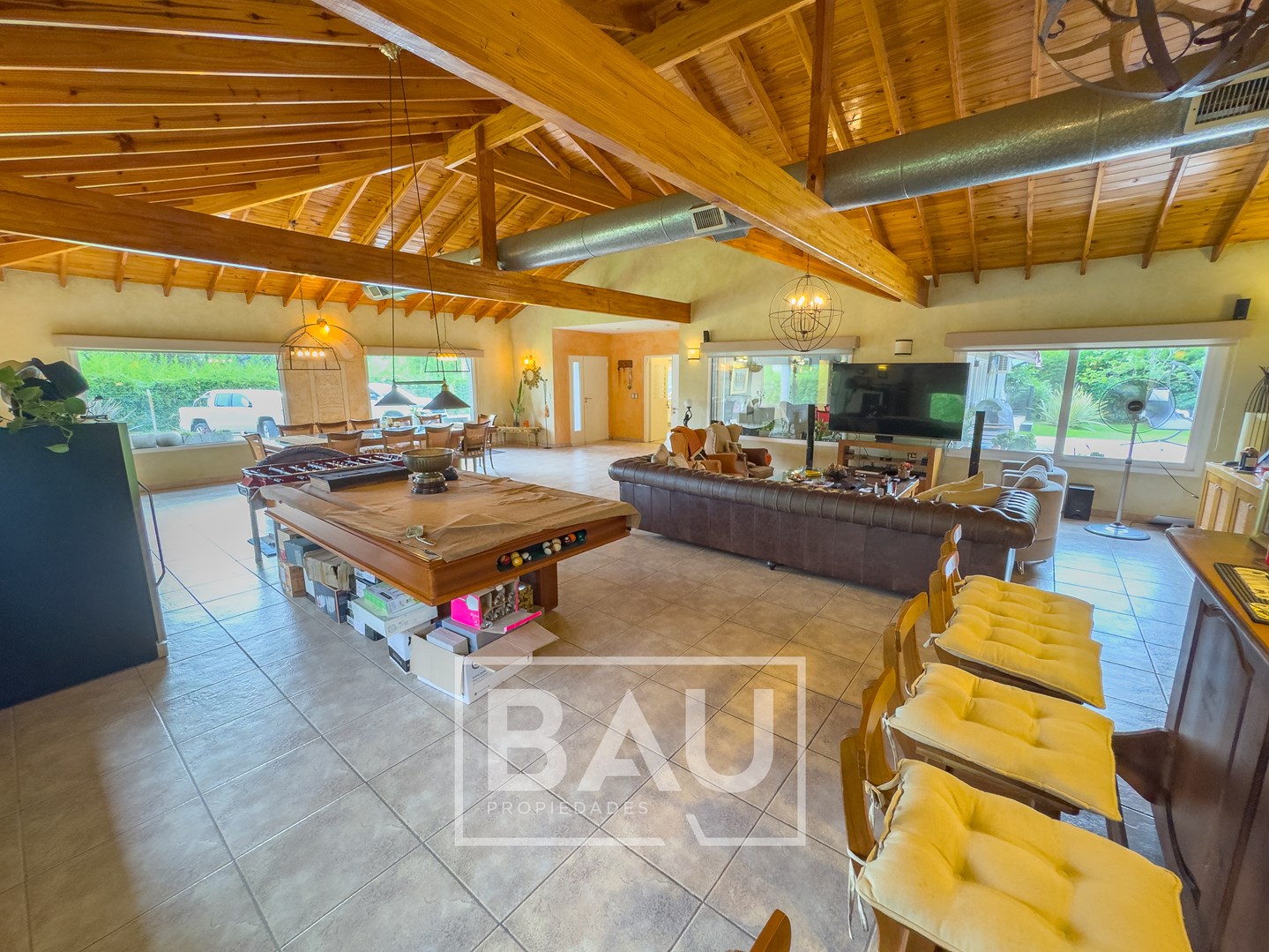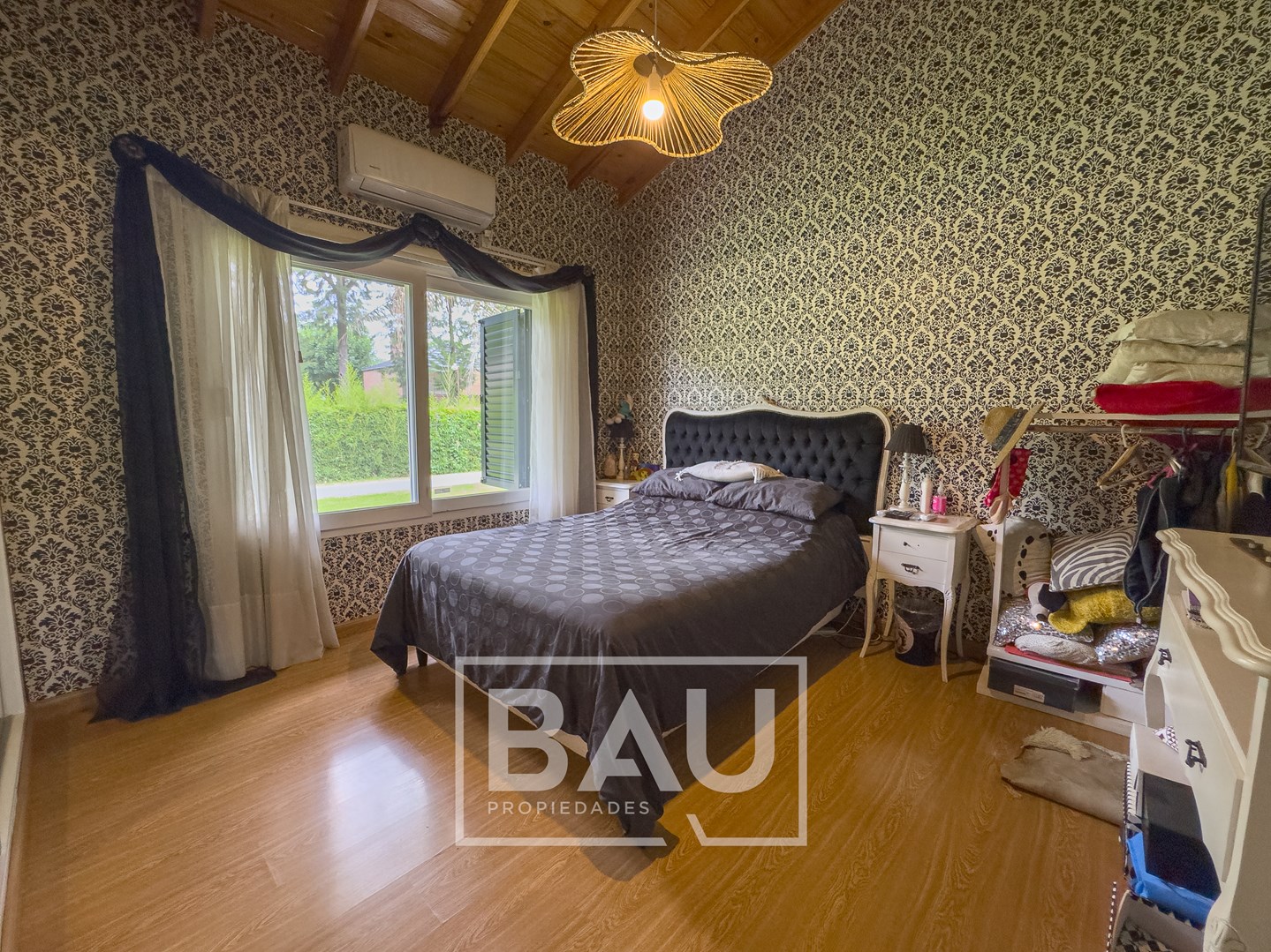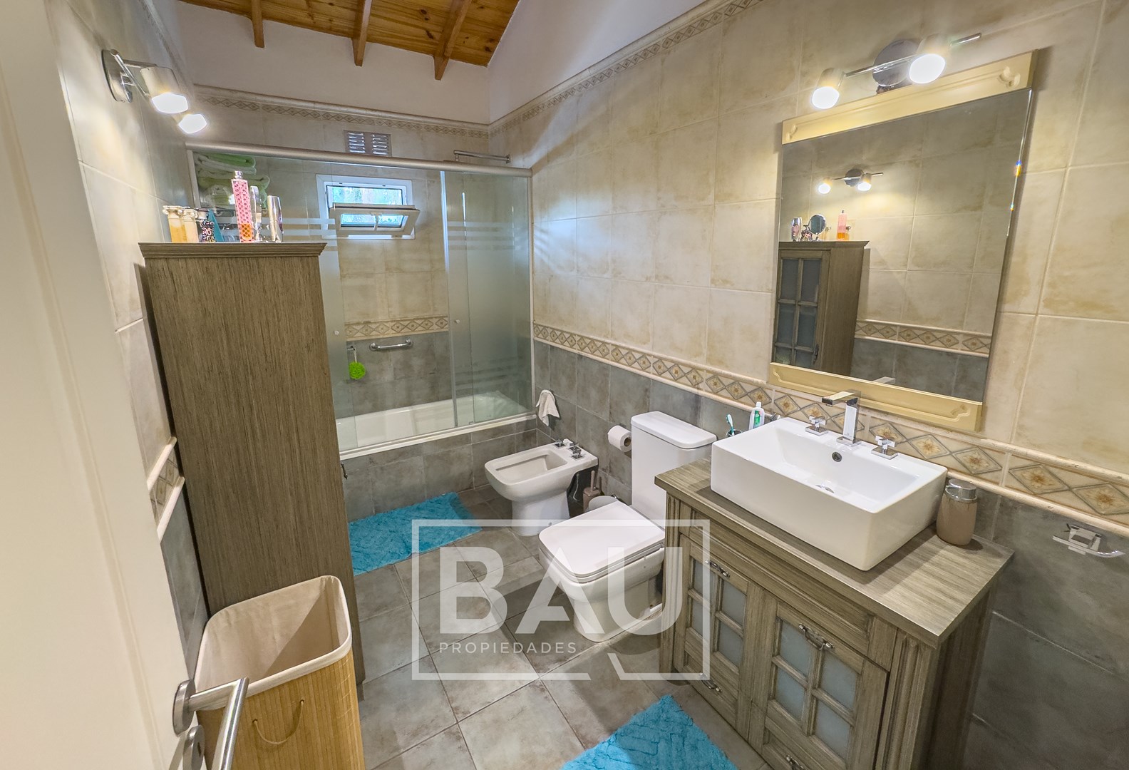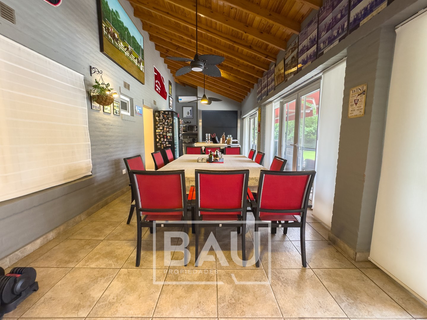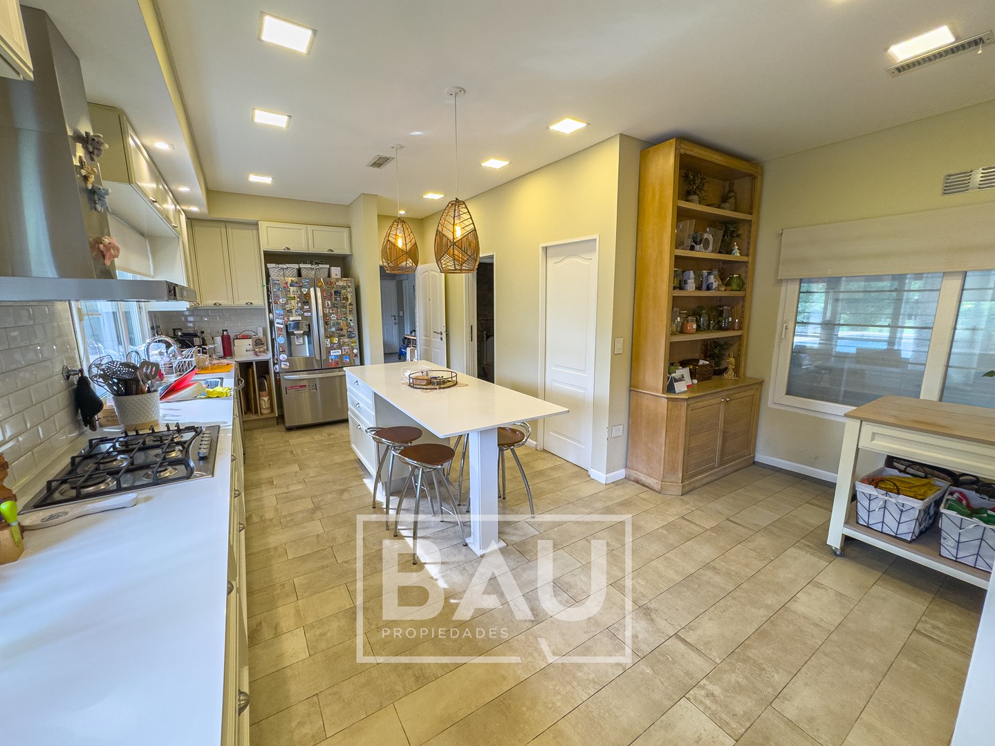 BAU PROPIEDADES – VENTA – CASA EN UNA PLANTA – 4 DORMITORIOS – EXCELENTE CONSTRUCCIÓN – COUNTRY CLUB SAN DIEGO Sólido chalet tradicional desarrollado íntegramente en una planta, implantado sobre un amplio lote de 1.500 m², con muy buena orientación y un entorno consolidado. Una propiedad que se destaca por su calidad constructiva, funcionalidad y luminosidad en todos sus ambientes. Al ingresar, un hall de recepción da paso a un amplio living comedor con barra, grandes ventanales al jardín y excelente entrada de luz natural. La casa cuenta con calefacción central por aire mediante dos calderas y aire acondicionado en todos los ambientes, garantizando confort durante todo el año. La cocina se presenta muy bien equipada, con mesadas de Silestone, campana de acero, horno empotrado, gran espacio de guardado y despensa. Conecta de manera práctica con el sector social y el quincho. El quincho cerrado funciona como un verdadero segundo estar, con parrilla de acero con puerta guillotina y horno pizzero Tromen. La distribución privada ofrece cuatro dormitorios. El dormitorio principal es en suite con vestidor y dos baños completos, brindando comodidad y privacidad. Dos dormitorios adicionales con placard comparten un baño completo, y se suma un cuarto dormitorio que puede utilizarse como habitación de huéspedes o escritorio. Además, cuenta con un playroom independiente. En el exterior, el jardín parquizado se disfruta plenamente. La piscina climatizada, revestida en venecitas, mide aproximadamente 12 x 5 metros y cuenta con solárium de piso antideslizante. Se suma un baño de pileta con vestuario, jardín de invierno, gazebo vidriado con vista abierta al parque, toldo corredizo y riego automático. La propiedad dispone de cochera cubierta para dos autos, espacio de guardado adicional, galpón y sala de máquinas. Como valor agregado, cuenta con grupo electrógeno a gas de 40 kVA y cortinas blackout automatizadas. Todas las aberturas son de PVC con DVH, optimizando aislamiento térmico y acústico. Una casa muy completa, bien mantenida y lista para mudarse, ideal para quienes buscan vivir en una sola planta, con amplios espacios interiores y exteriores, dentro de un entorno seguro y consolidado. Consultanos para más información o para coordinar una visita. Esta propiedad merece ser recorrida para apreciar cada detalle. *La información comercial incluida representa material de carácter informativo y/o ilustrativo, pudiendo no ser exacta, estar sujeta a errores, omisiones y cambios, incluyendo el precio o la retirada de la oferta sin previo aviso. BAU PROPIEDADES SAN DIEGO