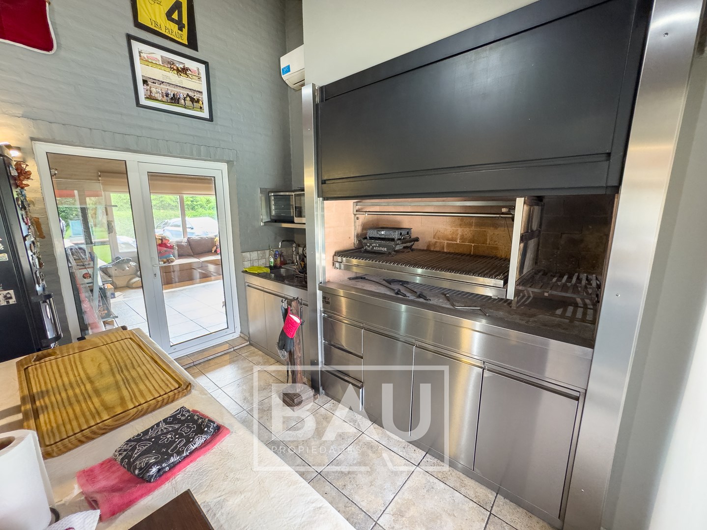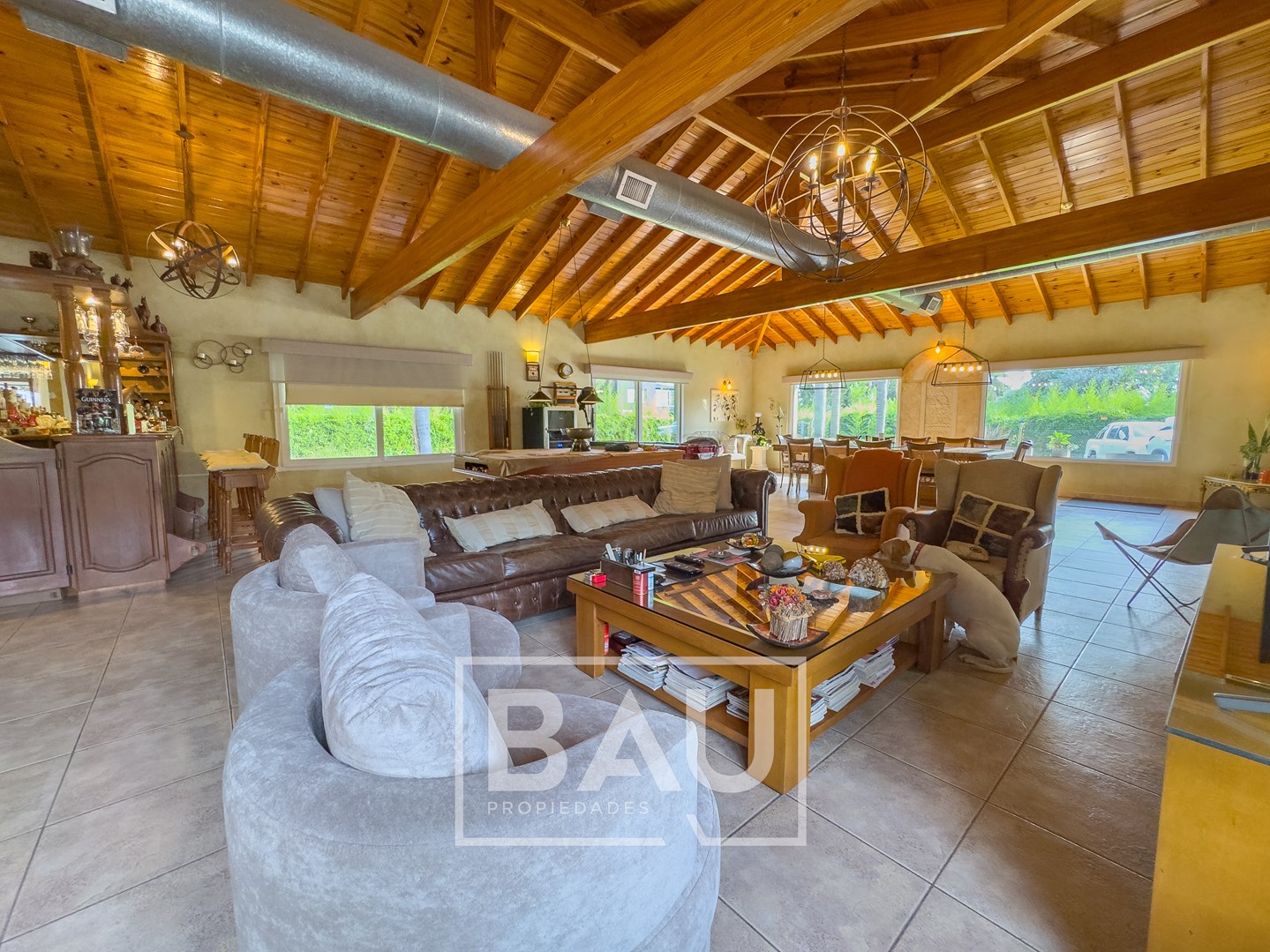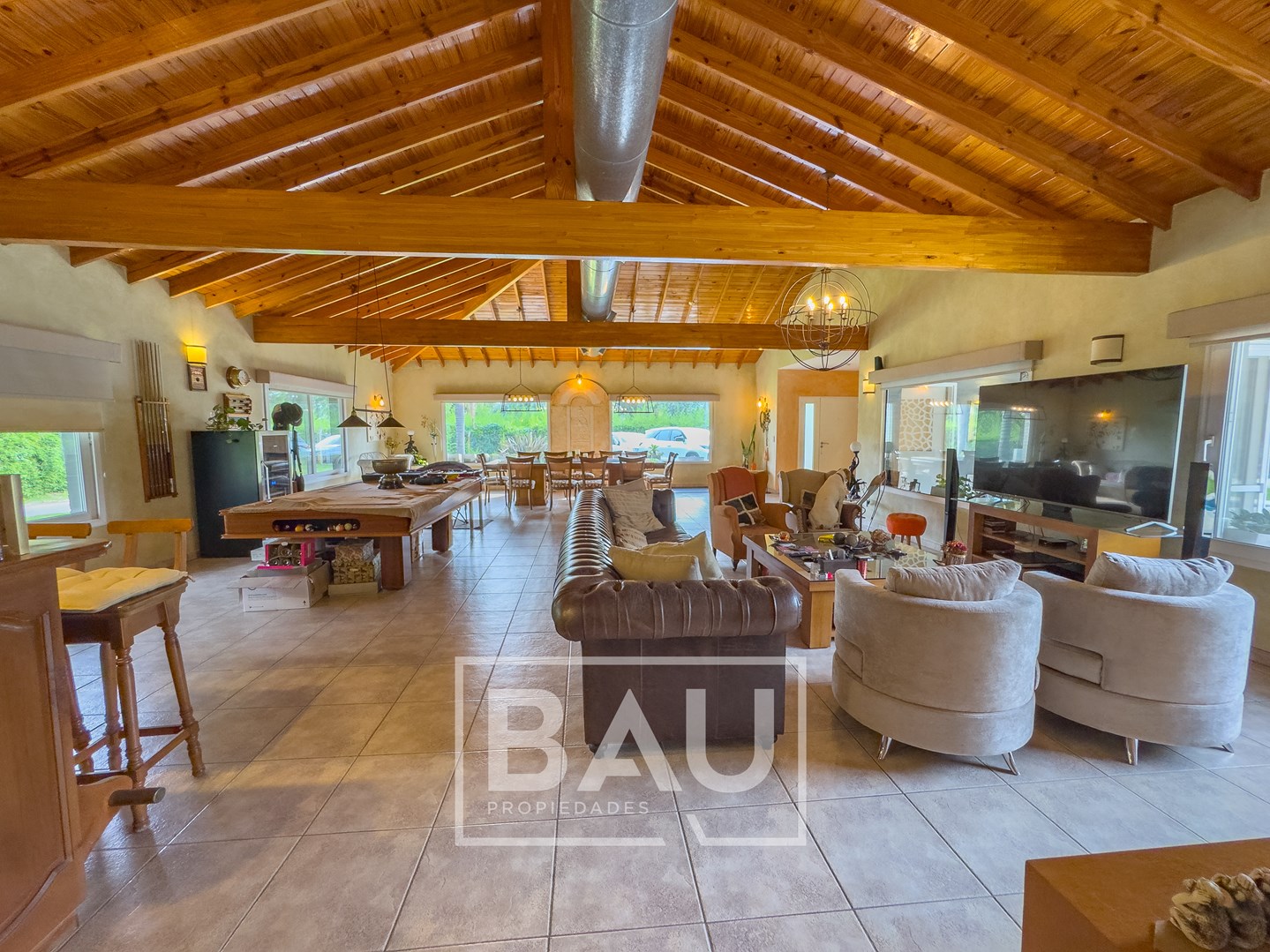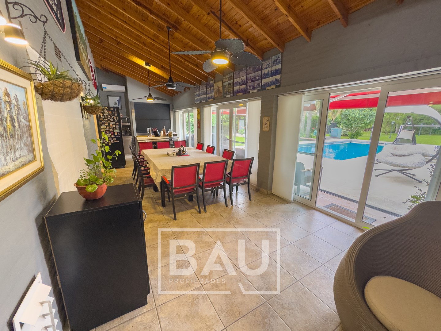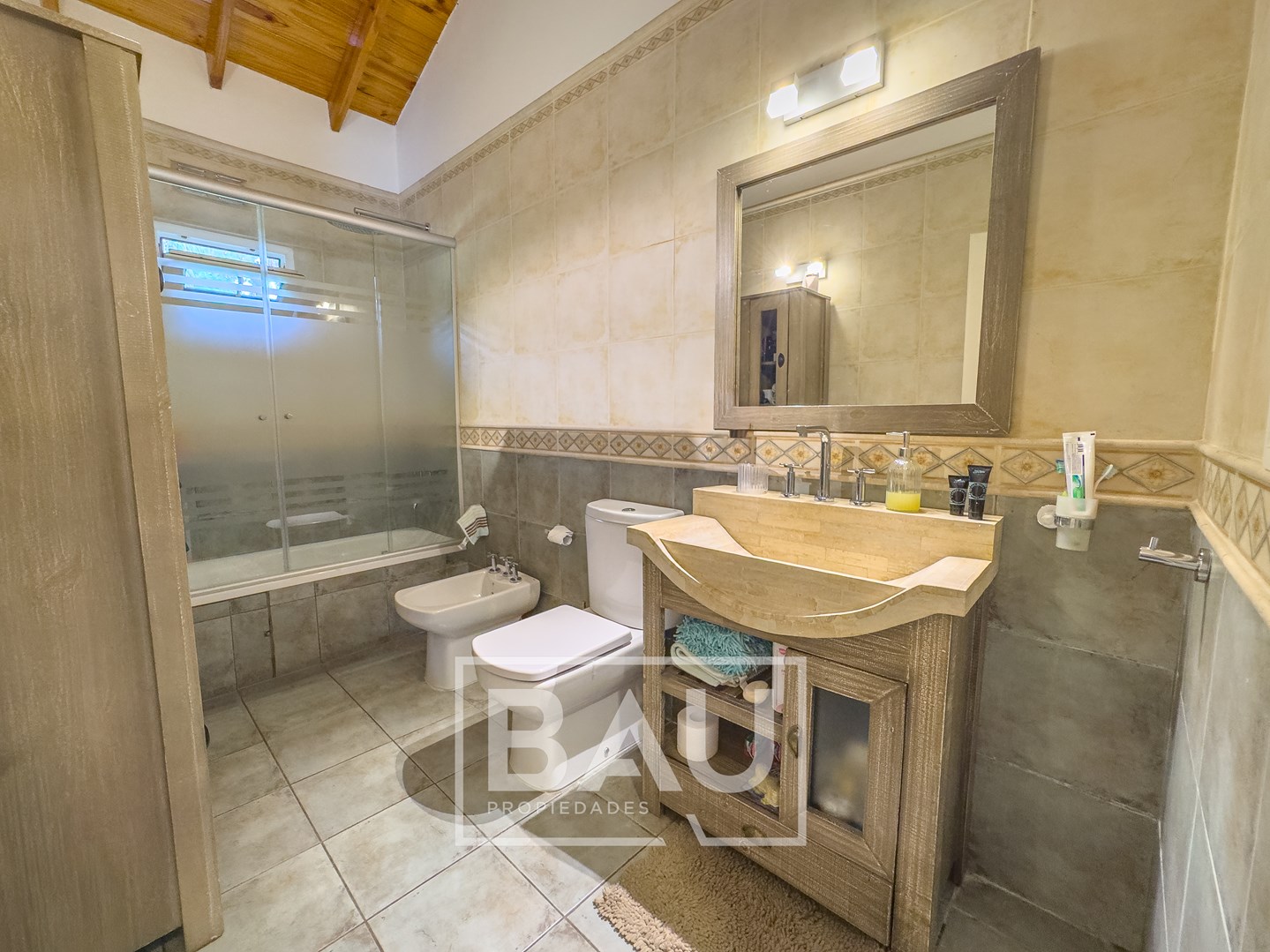 BAU PROPIEDADES – VENTA – CASA EN UNA PLANTA – 4 DORMITORIOS – EXCELENTE CONSTRUCCIÓN – COUNTRY CLUB SAN DIEGO Sólido chalet tradicional desarrollado íntegramente en una planta, implantado sobre un amplio lote de 1.500 m², con muy buena orientación y un entorno consolidado. Una propiedad que se destaca por su calidad constructiva, funcionalidad y luminosidad en todos sus ambientes. Al ingresar, un hall de recepción da paso a un amplio living comedor con barra, grandes ventanales al jardín y excelente entrada de luz natural. La casa cuenta con calefacción central por aire mediante dos calderas y aire acondicionado en todos los ambientes, garantizando confort durante todo el año. La cocina se presenta muy bien equipada, con mesadas de Silestone, campana de acero, horno empotrado, gran espacio de guardado y despensa. Conecta de manera práctica con el sector social y el quincho. El quincho cerrado funciona como un verdadero segundo estar, con parrilla de acero con puerta guillotina y horno pizzero Tromen. La distribución privada ofrece cuatro dormitorios. El dormitorio principal es en suite con vestidor y dos baños completos, brindando comodidad y privacidad. Dos dormitorios adicionales con placard comparten un baño completo, y se suma un cuarto dormitorio que puede utilizarse como habitación de huéspedes o escritorio. Además, cuenta con un playroom independiente. En el exterior, el jardín parquizado se disfruta plenamente. La piscina climatizada, revestida en venecitas, mide aproximadamente 12 x 5 metros y cuenta con solárium de piso antideslizante. Se suma un baño de pileta con vestuario, jardín de invierno, gazebo vidriado con vista abierta al parque, toldo corredizo y riego automático. La propiedad dispone de cochera cubierta para dos autos, espacio de guardado adicional, galpón y sala de máquinas. Como valor agregado, cuenta con grupo electrógeno a gas de 40 kVA y cortinas blackout automatizadas. Todas las aberturas son de PVC con DVH, optimizando aislamiento térmico y acústico. Una casa muy completa, bien mantenida y lista para mudarse, ideal para quienes buscan vivir en una sola planta, con amplios espacios interiores y exteriores, dentro de un entorno seguro y consolidado. Consultanos para más información o para coordinar una visita. Esta propiedad merece ser recorrida para apreciar cada detalle. *La información comercial incluida representa material de carácter informativo y/o ilustrativo, pudiendo no ser exacta, estar sujeta a errores, omisiones y cambios, incluyendo el precio o la retirada de la oferta sin previo aviso. BAU PROPIEDADES SAN DIEGO