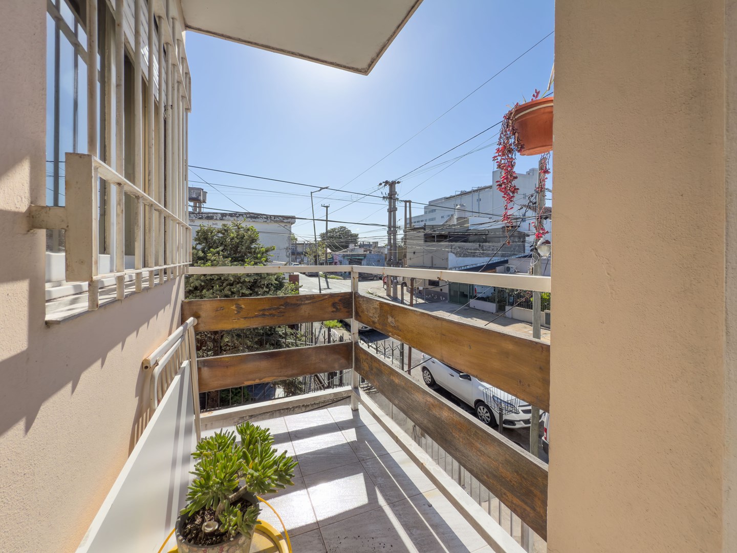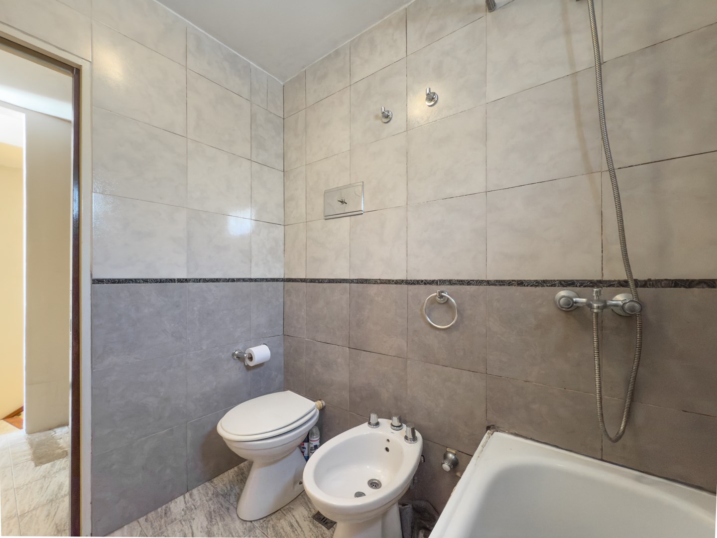 Baño completo con bañera. Pasillo conector con estufa. Balcón al frente.