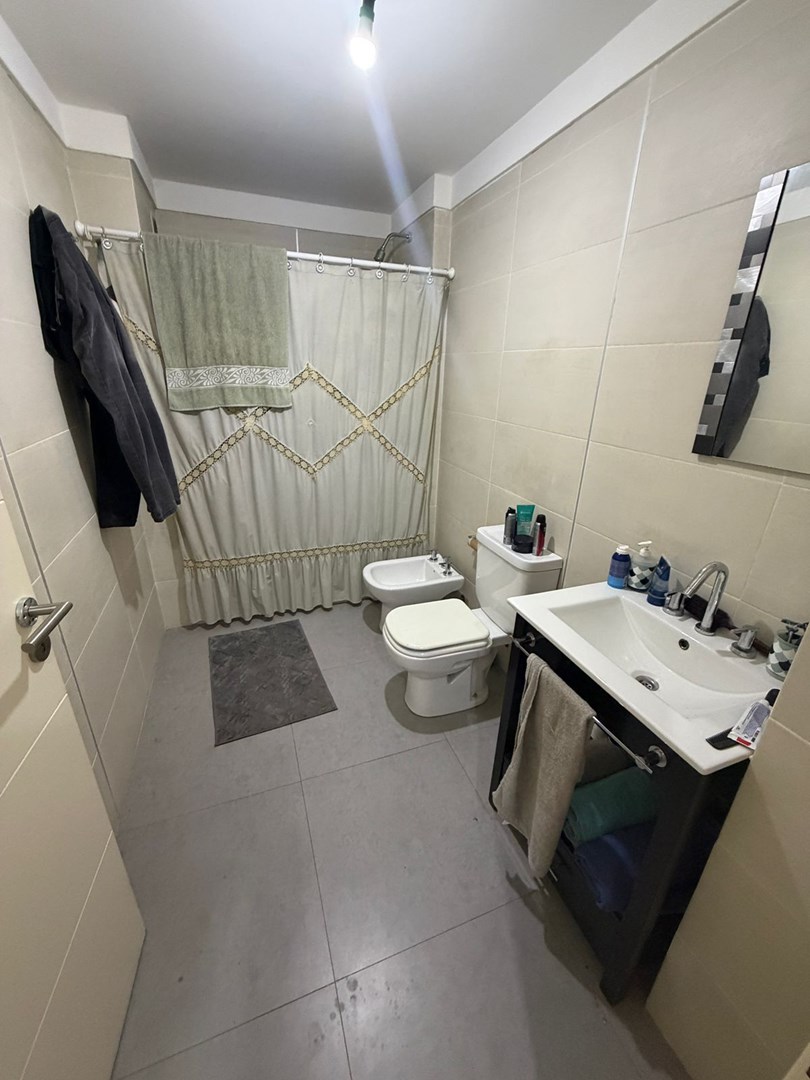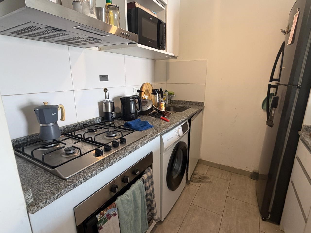 Baño completo con placar, cocina completa integrada con barra y espacio para instalar lavarropa.